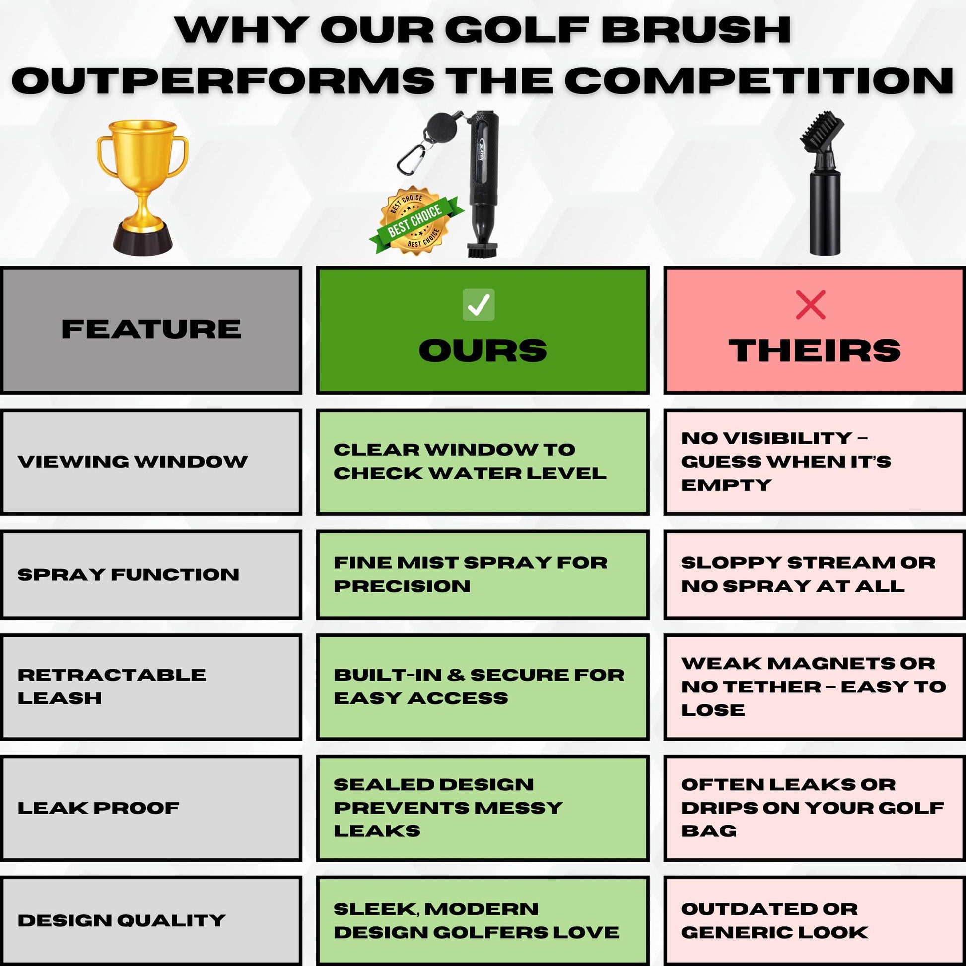 Unlike traditional brushes or cheap spray bottles that leak and make a mess, our upgraded golf brush features a controlled fine mist sprayer that evenly cleans club faces without over-saturating. The 2.5 oz leak-proof water reservoir is built to last the whole round, and the clear viewing window ensures you always know when it’s time to refill — no more guessing mid-round.
